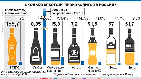 Но, справедливости ради, водка и пиво остаются самым продаваемым алкоголем в России. Водочные продажи за 10 месяцев года – 68,8 млн декалитров (1 декалитр – это 1 ящик из 20 бутылок по 0,5 л), пивные – 557,4 млн.